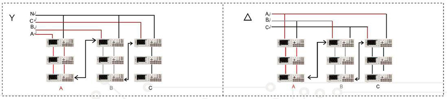 IT8600提供多臺并聯(lián)、三相與并聯(lián)三相的功能,可以實現(xiàn)對于三相交流電源或者大功率電源的測試應(yīng)用。在三相并聯(lián)應(yīng)用中,用戶可以根據(jù)實際需求實現(xiàn)Y型和Δ型的連接方式,進行自由靈活的搭配。IT8600還可以實現(xiàn)交流380V的輸入,通用,多元的測試需求。